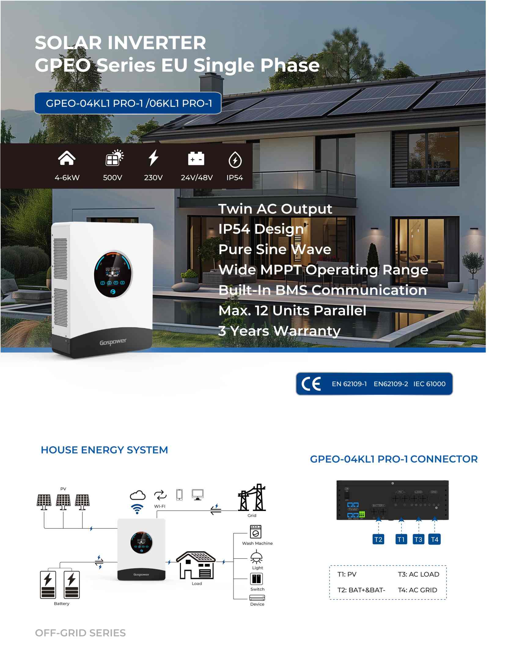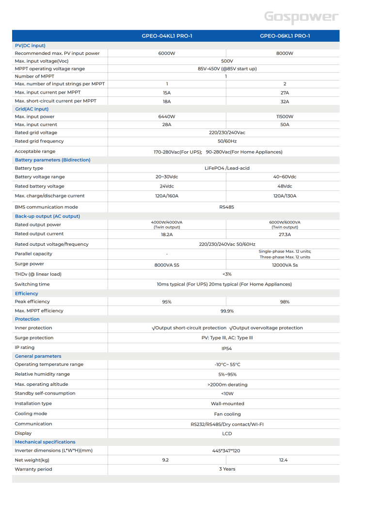 Gospower GPEO-04KL1 PRO-1 pure sine wave solar inverter is a perfect design for home- installation with its compact size and quick setting. With a wide MPPT operating range of 85-450V, Gospower inverter is a good option for your household system.